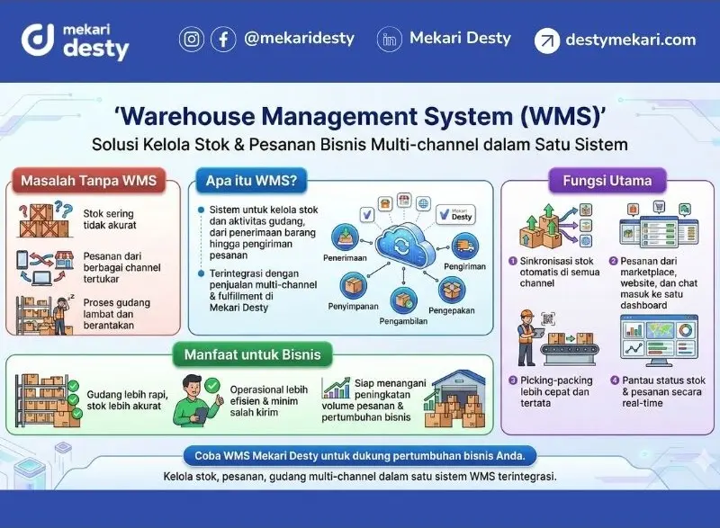 Semakin banyak channel penjualan, semakin rumit pengelolaan gudang. Karena itu, bisnis membutuhkan sistem yang bisa mengatur stok dan pesanan dengan rapi, yaitu Warehouse Management System (WMS). Mekari Desty menjadi solusi bisnis untuk mengelola gudang, pesanan, dan pengiriman dalam satu ekosistem, karena WMS terhubung langsung ke sistem penjualan dan fulfillment.