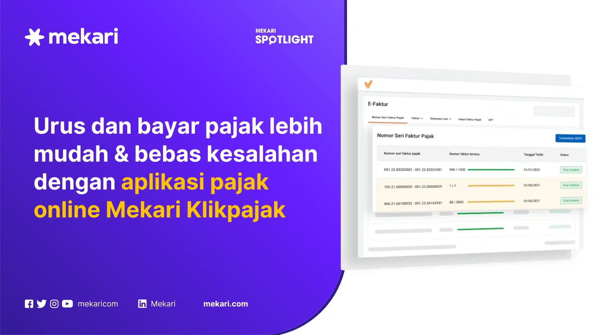- Mekari Klikpajak adalah aplikasi pajak online yang mengintegrasikan e-Faktur, e-Bupot, e-Filing, dan fitur lainnya untuk memastikan kepatuhan pajak perusahaan lebih mudah dan tepat.